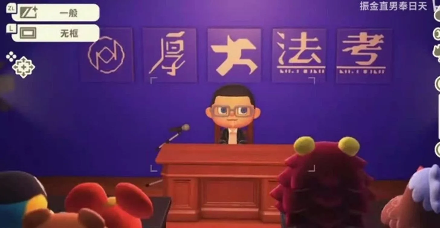 Luo Xiang and his usual video backdrop, recreated in Animal Crossing: New Horizons by Bilibili user 振金直男奉日天.